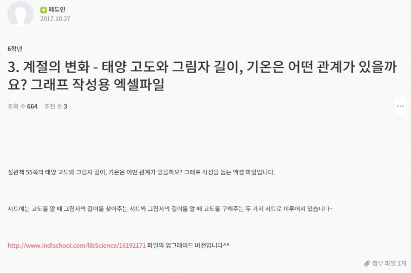 교과전담이라 인디스쿨 방문이 뜸했었는데, 필요한 자료가 있어서 방문하게 되었습니다. 로그인을 한 순간, 알림이 딱! 바로 댓글 알림인데요. 바로 제가 지난해 올렸던 과학 자료 달린 댓글이었습니다.