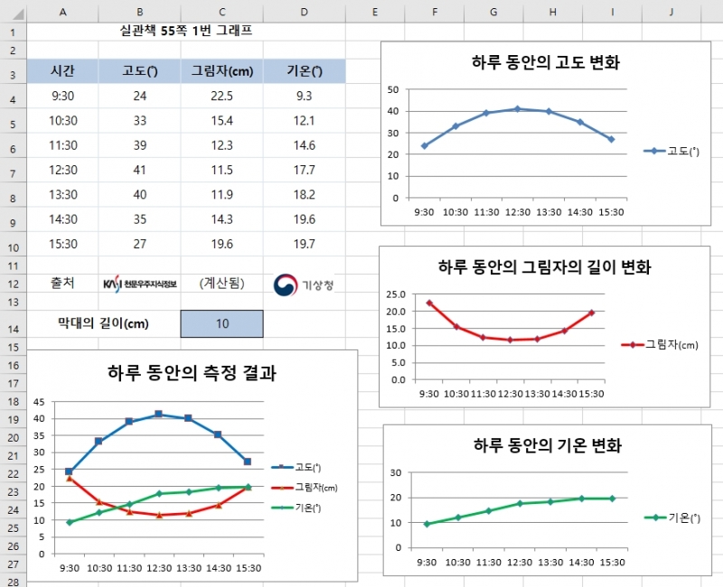 저는 늦게 이 자료를 봐서 도구를 이용하지는 못하고, 그림자의 길이만 알면 태양의 고도를 구할 수 있는 간단한 엑셀 파일을 만들어 올렸습니다. 간단하게 삼각함수(atan)만 사용해서 막대의 길이는 고정, 시간대별로 그림자의 길이를 입력하면 태양 고도가 나타나도록만 해서요.(무려 2013년도에 올린 자료이네요)
