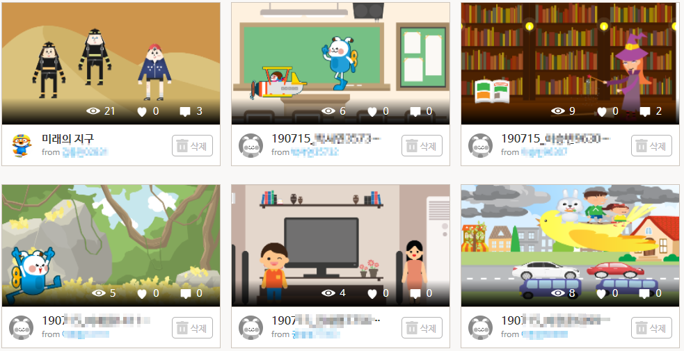 학생이 원하는 동작을 할 수 있도록 주변의 짝과 협력하여 간단한 애니메이션을 만들어 보도록 하였는데, 생각보다 많은 학생들이 흥미를 가지고 참여하였답니다. 책의 내용을 소개하거나 미세먼지에 대해 알려주는 내용들이 많았습니다.