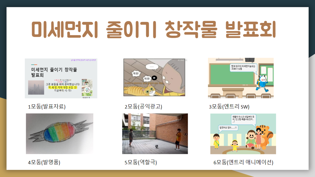 그점에 착안하여, 우리 학급에서도 온북스 프로젝트의 산출물로 '미세먼지 줄이기 창작물 발표대회'를 실시하기로 하였습니다.