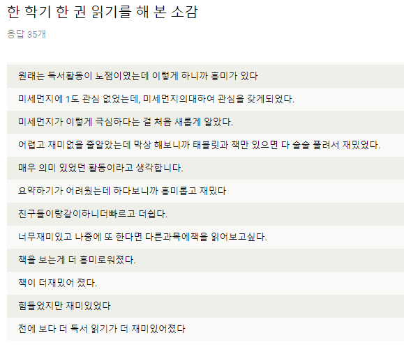 온북스 프로젝트를 실시한 결과를 살펴보기 위해 마지막으로 사후 검사를 실시하고 학생들이 3주간 어떤 변화를 얻게 되었는지 살펴보았더니, 재미가 없었던 독서활동이 흥미있고 책의 주제였던 미세먼지에 대한 내용도 새롭게 알게 되었다는 내용이 많았습니다.
