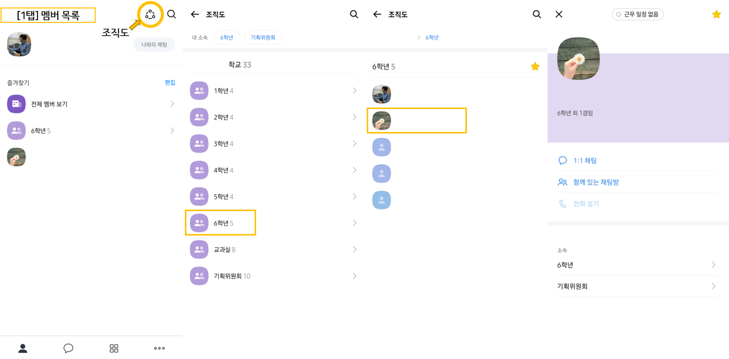 멤버 목록이 있는 1탭에서는 모든 구성원이 다 나타나지는 않고, '조직도'를 선택해야 나타난다. 조직 부서 또는 특정한 사용자를 즐겨찾기해 두면 쉽게 대화를 이어갈 수 있었다. 구성원이 많은 경우에는 유용한 기능인 것 같은데, 구성원이 적다면 설정상 전체 멤버를 볼 수도 있게 한다면 좋겠다.