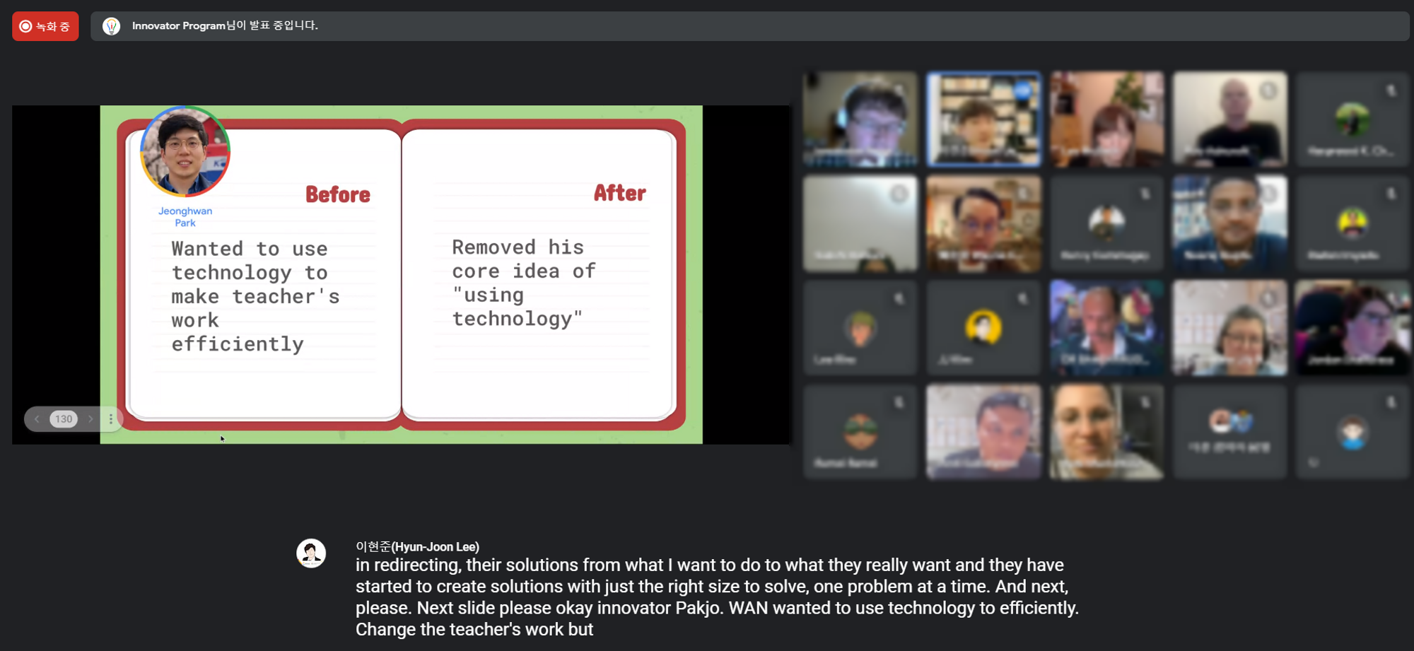 드디어 마지막 주 아카데미 시간이 다가왔습니다. "혁신은 마음가짐"이라는 주강사 Les의 축사에 이어 몇 개의 그룹이 하나의 소회의실에서 자신의 피치 비디오를 소개하는 시간을 가졌습니다. 1그룹 1번이다 보니 맨 처음에 소개되어서 조금 부끄럽기는 했지만 여러 영상을 봐야하는 다른 참가자들을 생각하니 그렇게 자신없거나 떨리지는 않았습니다. 피치 타임을 가진 이유는 다른 지원자가 자신과 비슷한 주제를 다룬다면 협업해 보라는 의미였는데, 언어와 억양의 한계로 잘 파악하지는 못했습니다.